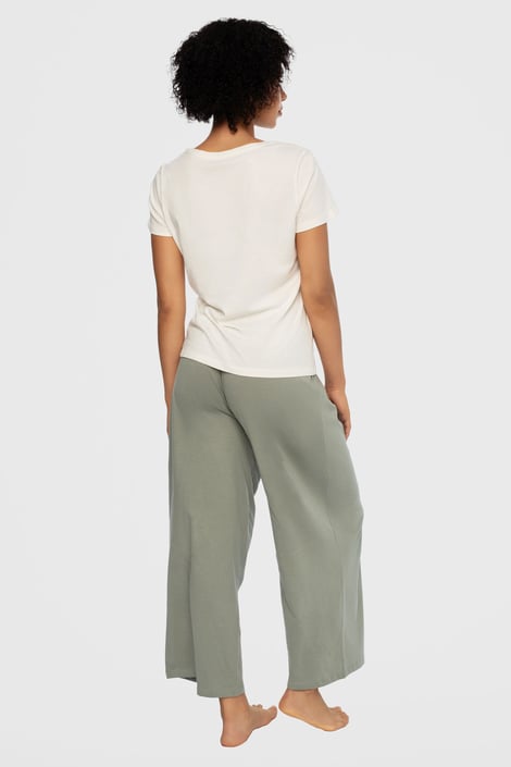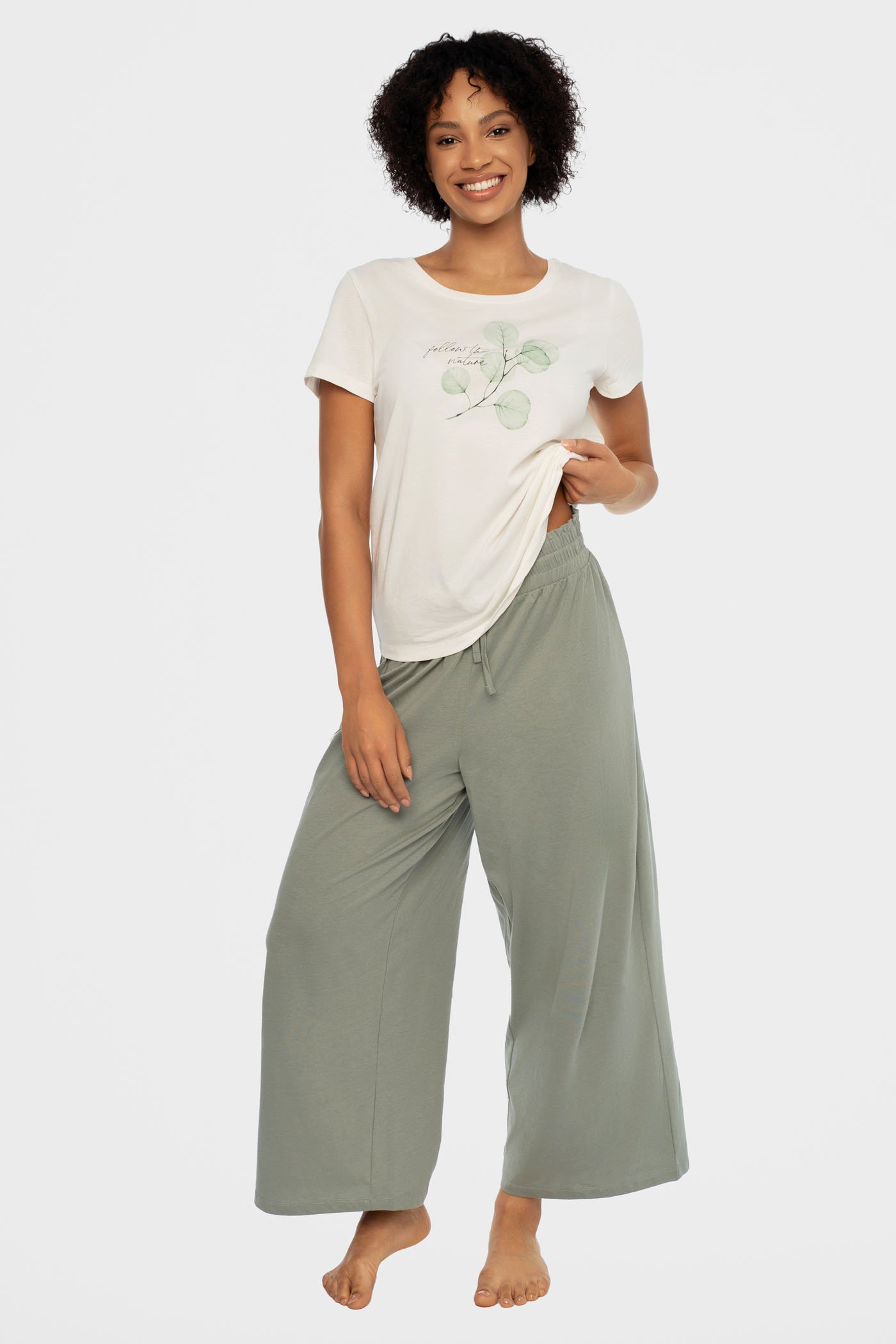 Damska piżama Dreamer będzie Cię rozpieszczać bawełną i wyjątkowo wygodnym krojem. T-shirt w subtelnym kremowym kolorze zdobi delikatny nadruk, a długie spodnie dzwony mają w talii miękkie przeszycie oraz ściągany sznurek do jej regulacji.