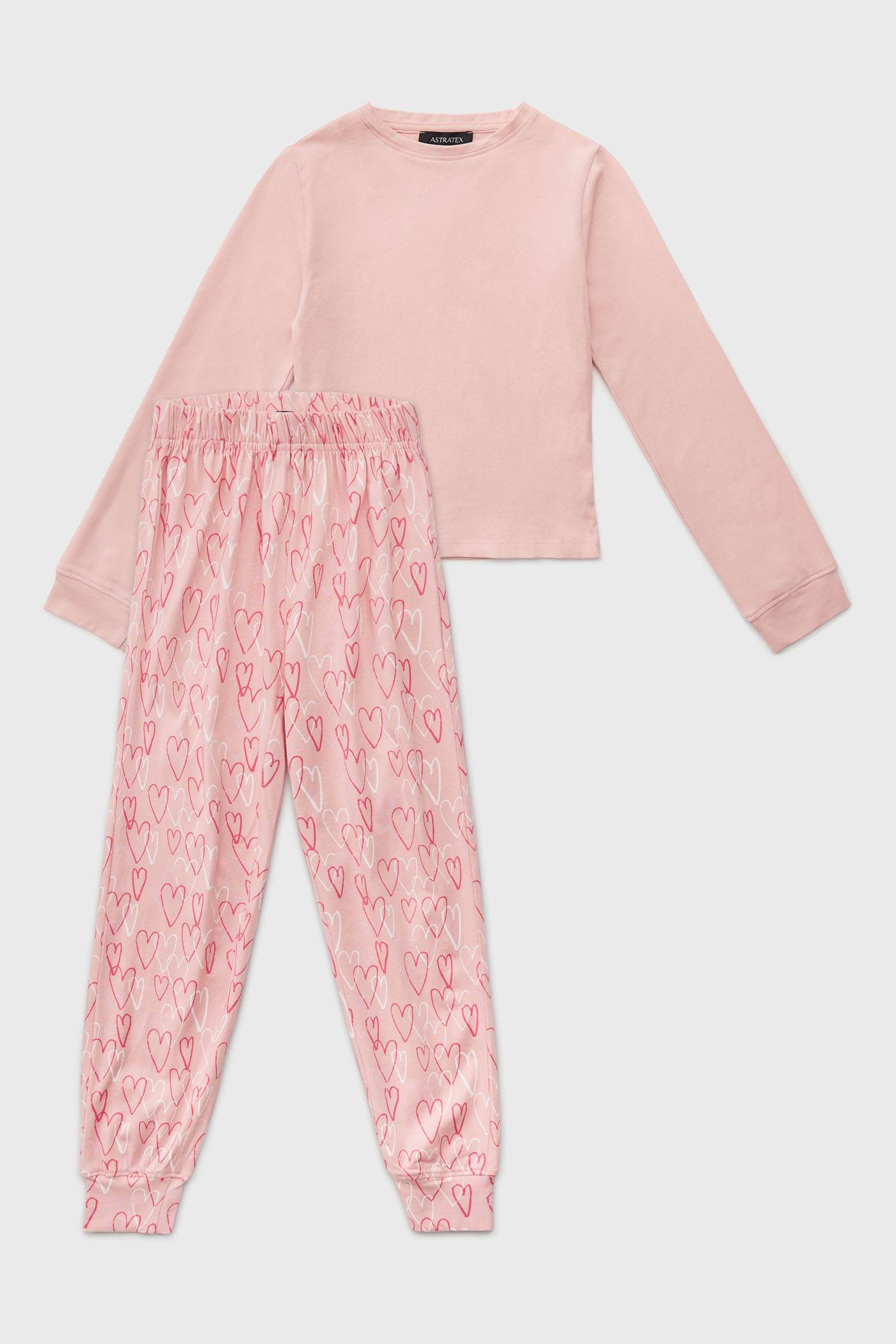 Bawełniana piżama dziewczęca Hearts z miękkiej dzianiny zapewnia wygodny sen. Jednobarwna koszulka w komplecie ze spodniami z nadrukiem na całej powierzchni. Rękawy i nogawki są zakończone mankietami. Projekt specjalistów z Astratexu.