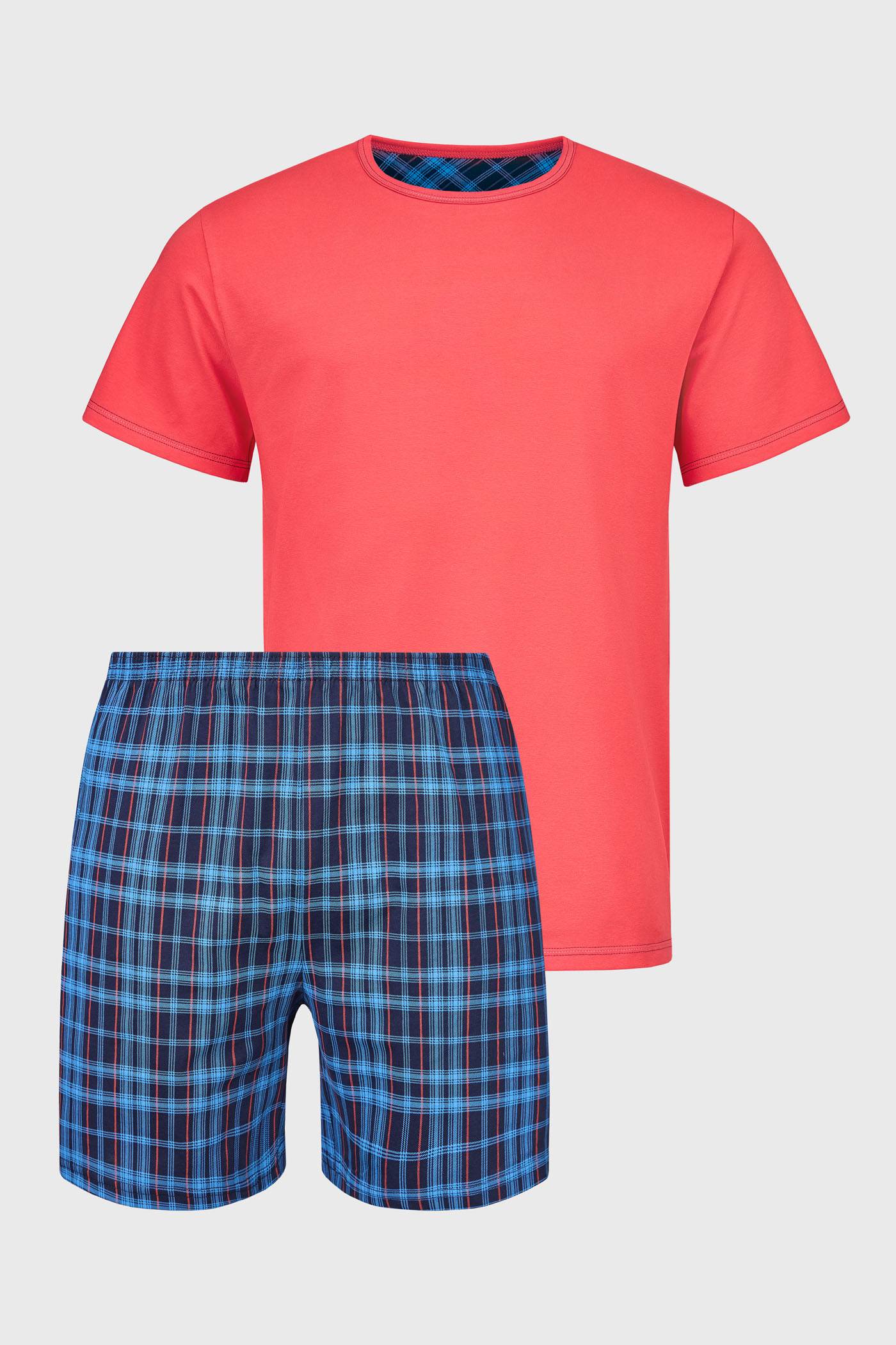 Bawełniana piżama męska Bricke z miękkiej tkaniny zapewnia komfort. Luźny jednobarwny T-shirt dopełniają krótkie spodenki w kratkę z przeszywaną gumą w pasie.