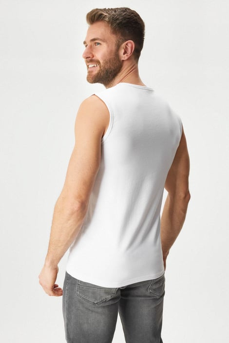 Bawełniany top męski nátělník MEN-A Oto II bez rękawów i z dekoltem w serek to model basic, którego nie powinno zabraknąć w Twojej szafie. Doskonale miękka dzianina jest maksymalnie wygodna. Gładki model bez nadruku i napisów jest dobry na każdą okazję. Możesz go nosić w gorące dni jako samodzielny element odzieży oraz w zimie jako spodnią warstwę, na przykład pod koszulą. Projekt specjalistów z Astratexu.