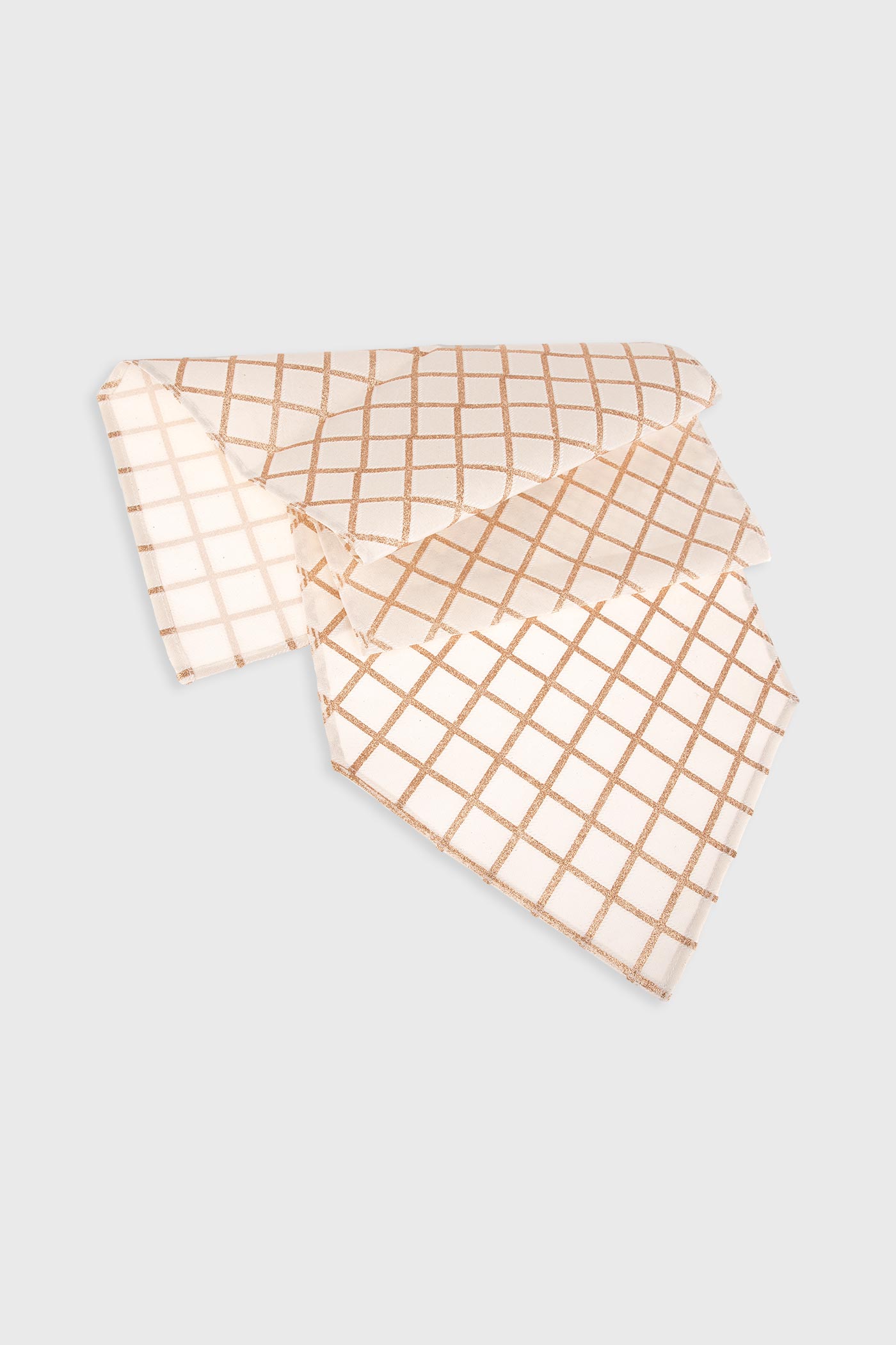 Tekstylny bieżnik/obrus Check wyczaruje odpowiednią świąteczną atmosferę. Beżowe tło jest ozdobione złotym wzorem w kratkę. Krótsze boki bieżnika są wycięte w szpic.