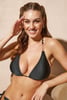 Biustonosz bandeau od stroju kąpielowego Sheen Black V o prostym, mimo to popularnym trójkątnym kroju. Miseczki mają wyjmowane wkładki do indywidualnego modelowania biustu. Ramiączka i obwód możesz zawiązać tak jak potrzebujesz. Model jest ozdobiony metalowymi kółeczkami. Projekt specjalistów z Astratexu.