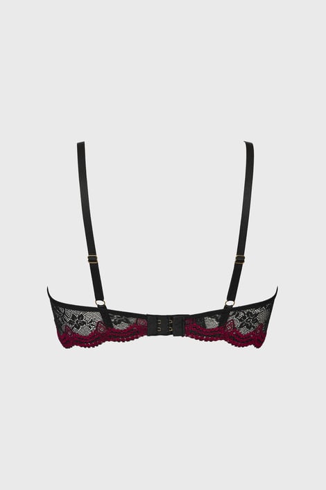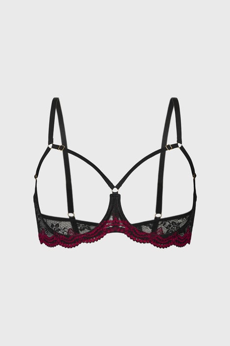 Biustonosz erotyczny Red Waves zmysłowo wyeksponuje Twoje piersi. Górną linię dekoltu podkreślają cienkie paski, a obwód jest wykonany z koronki z kontrastowym haftem.