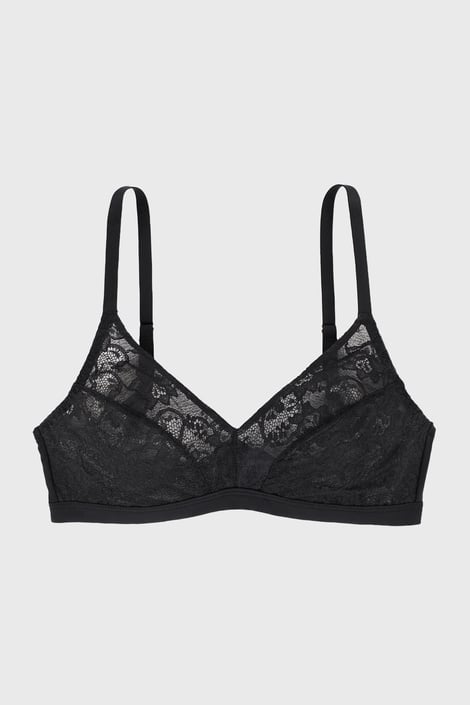 Biustonosz Love Me Again Bralette bez fiszbinów, odpowiedni zarówno dla Pań z mniejszym, jak i większym biustem. Koronkowe miseczki dla większej wygody są podszyte delikatnym tiulem. Elastyczny obwód z laserowo wycinanymi i klejonymi brzegami nie uciska w żadnym miejscu. Biustonosz należy do kolekcji stworzonej we współpracy z brytyjską piosenkarką Raye.
