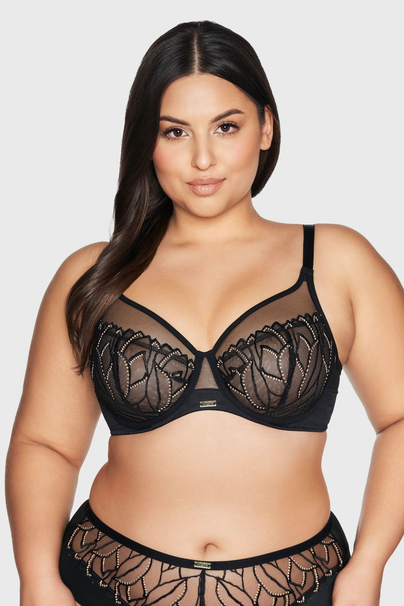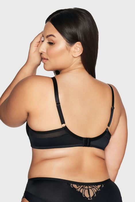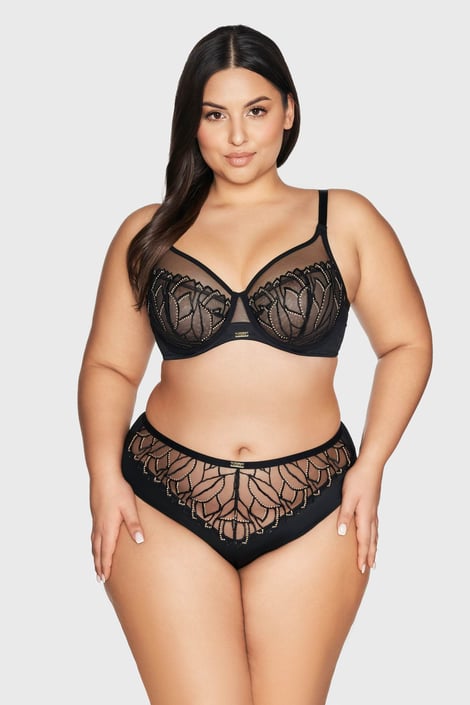 Nieusztywniany biustonosz Miray Maxi dla kobiet z obfitym biustem, które uwielbiają elegancką bieliznę. Miseczki z prześwitującej siateczki są lekkie jak pajęczyna, miękko się dopasowują i zachowują naturalny kształt piersi. Ozdobą tego modelu jest efektowny kwiatowy haft ze złotymi detalami.