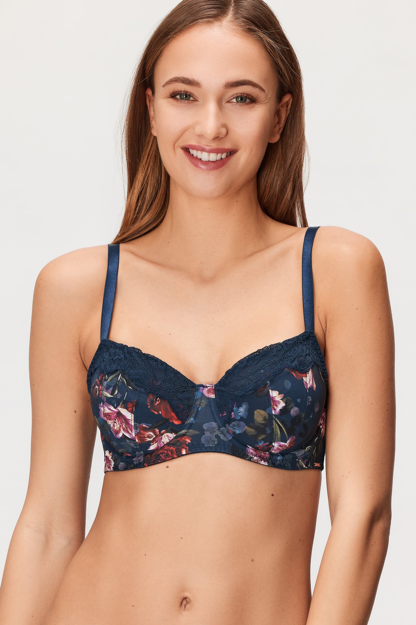 Nieusztywniany biustonosz Mystic został zaprojektowany z myślą o komforcie noszenia dla Pań z pełnym biustem. Miseczki są uszyte z miękkiej mikrofibry podszytej tiulem i nadają piersiom całkowicie naturalny wygląd. Podparcie zapewnią im wszyte fiszbiny i wysoki mostek. Połączenie kwiatowego wzoru z lekką koronką jest niezwykle urokliwe.