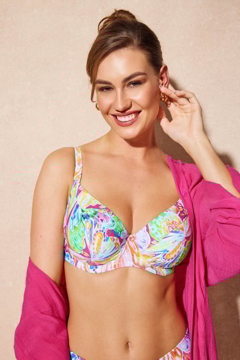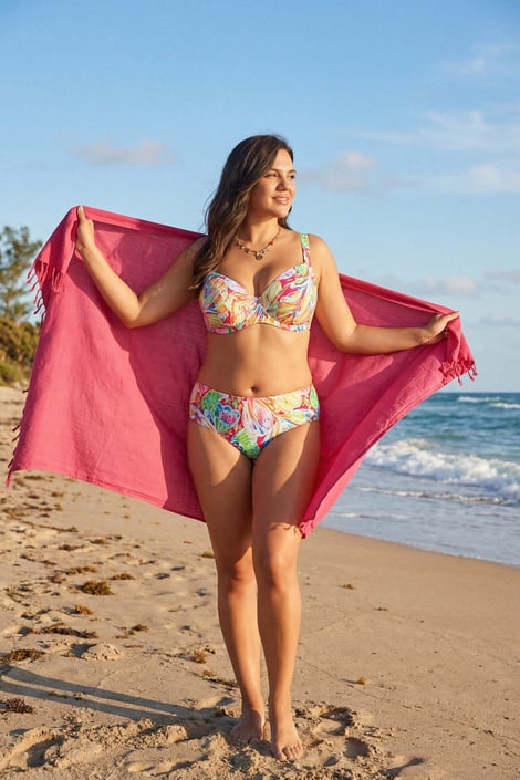 Biustonosz od stroju kąpielowego Clara Big zapewnia komfort dużym piersiom. Pojemne miseczki o kroju typu T dają biustowi nie tylko niezawodne wsparcie, lecz także oczekiwany kształt. Z bogatym wzorem w żywych tropikalnych barwach.
