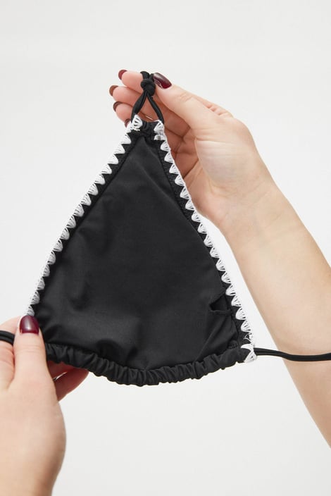 Biustonosz od stroju kąpielowego Crochea o popularnym trójkątnym kroju. Miseczki mają wyjmowane wkładki, którymi można indywidualnie wymodelować biust. Obwód i ramiączka są zawiązywane. Końce sznurkowych ramiączek są ozdobione koralikami w kształcie muszelek. Brzegi biustonosza mają modne obszycie w kontrastowym kolorze. Projekt specjalistów z Astratexu.