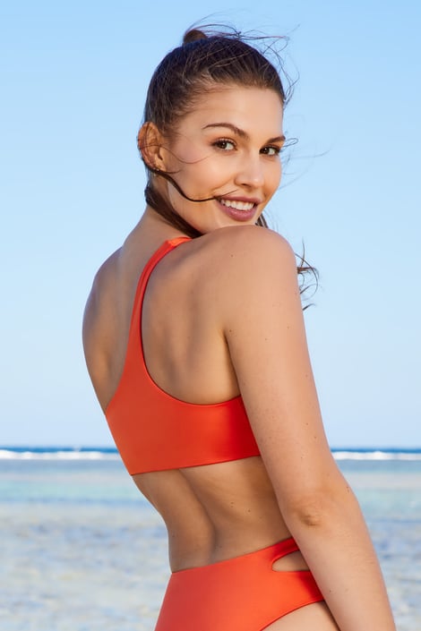 Nietypowo zaprojektowany biustonosz od kostiumu kąpielowego Muani w praktycznej dwustronnej wersji. Możesz wybrać intensywny róż lub modny ceglasty odcień.