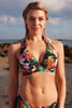 Biustonosz od stroju kąpielowego Riviera z wielobarwnym tropikalnym wzorem. Z nieusztywnianymi trójkątnymi miseczkami, które zapewniają dużym piersiom całkowicie naturalny kształt.