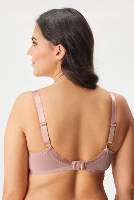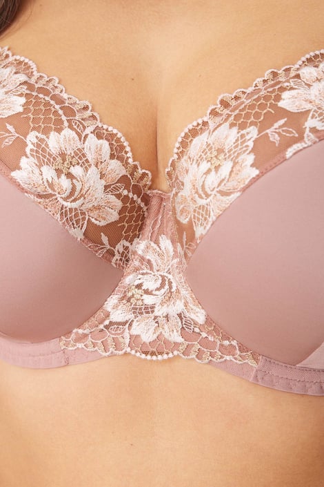 Biustonosz Lola wygodnie wesprze także duży biust. Pojemne miseczki na fiszbinach są miękko usztywniane w dolnej częsci i mają wygodną podszewkę z tkaniny. Linię dekoltu tworzy miękki tiul ze wzmocnionym brzegiem oraz bogatym kwiatowym haftem. Z ramiączkami o regulowanej długości.