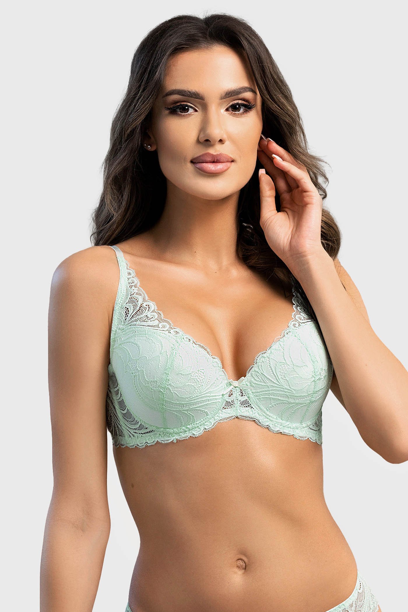 Biustonosz Adison w świeżym miętowym kolorze. Usztywniane miseczki są pokryte subtelną koronką, która przechodzi aż na ramiączka. Wszyte fiszbiny zapewniają konieczne podparcie także dużym piersiom.