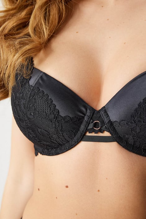 Biustonosz Jill Curves zapewni Twojemu biustowi doskonały kształt. Satynowo-koronkowe miseczki na fiszbinach są miękko usztywniane i zapewnią wygodę także dużym piersiom. Pośrodku biustonosza ozdobne paski strappy, takie same paski uzupełniają również tylną część obwodu z miękkiego tiulu. Ramiączka mają regulację długości.
