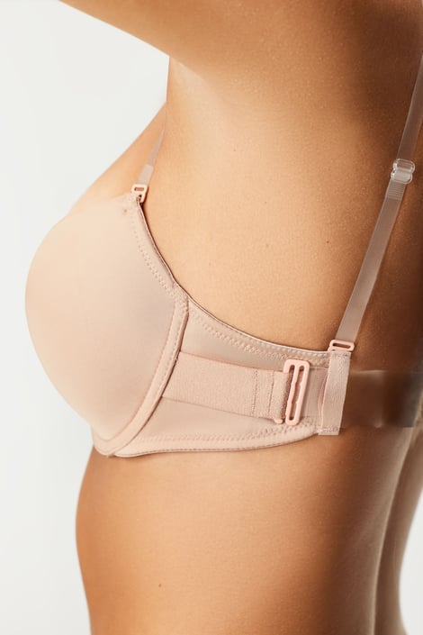 Gładki cielisty biustonosz Secret Tan to doskonały wybór do sukienek z odkrytymi plecami. Tylną część obwodu tworzy przezroczysty silikonowy pasek, który można dopasować do swojej figury za pomocą haftek. Z odpinanymi ramiączkami.