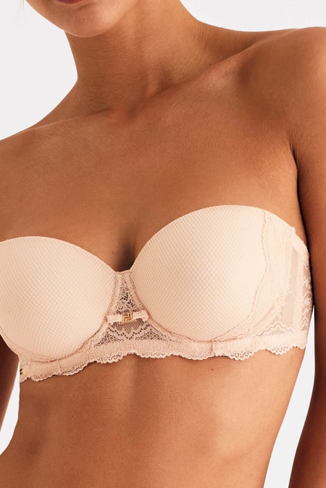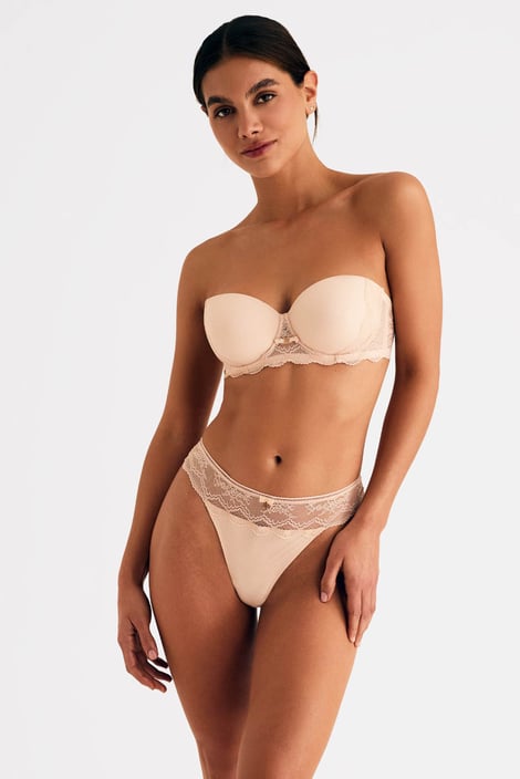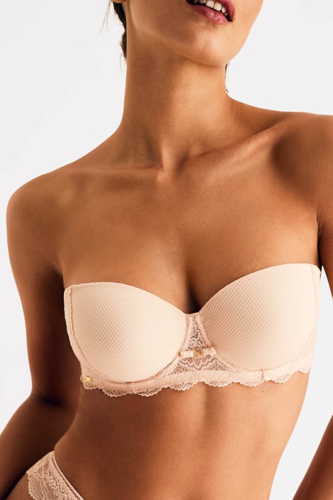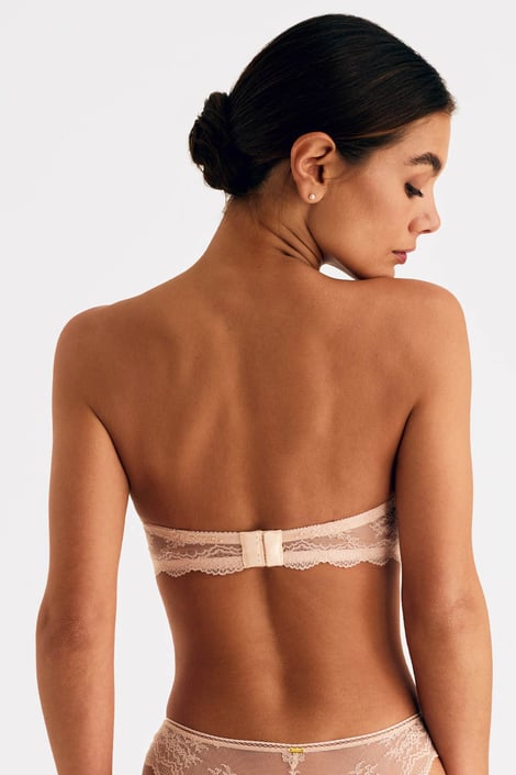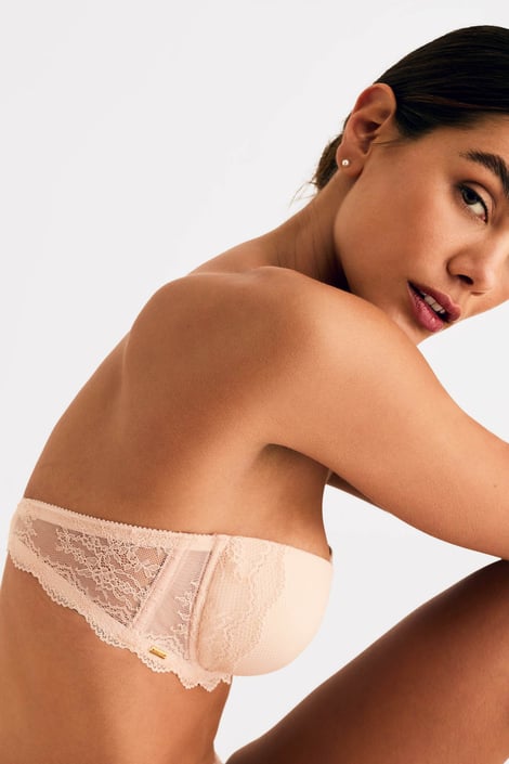 Biustonosz Selmark Manuela w doskonałym wydaniu z subtelnej koronki i siateczki. Usztywniane miseczki o kroju typu bardotka na fiszbinach ładnie podpierają biust i ładnie go zaokrąglają w górnej części. Ramiączka mają regulację długości i są odpinane z tyłu. Po wewnętrznej stronie tylnej części obwodu są silikonowe paski, które zapobiegają przesuwaniu się biustonosza po ciele.