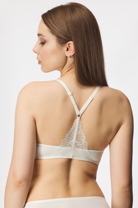 Biustonosz Zarya ozdobi Twoje plecy delikatną koronką z kwiatowym wzorem. Miękkie miseczki z niskim mostkiem pozwalają wyeksponować piersi nie tylko w głębokich dekoltach.