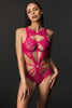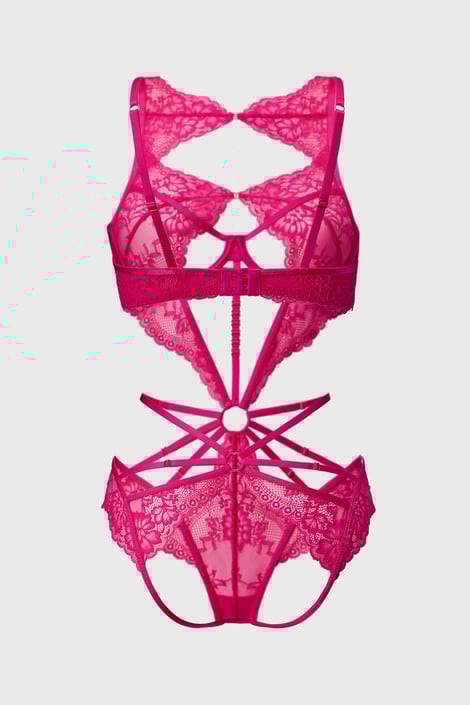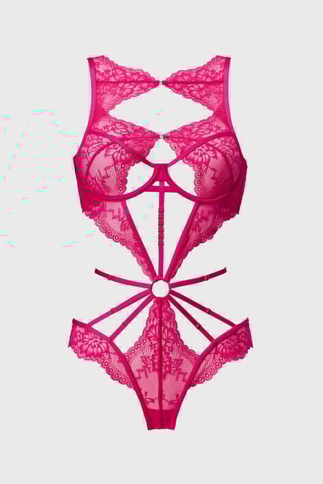 Body erotyczne Hunkemöller Bisous otuli Twoje ciało efektowną koronką i omota kuszącymi paskami strappy. Część majtkowa ma otwarty tył. Model w wyrazistym różowym kolorze, który zachwyca od pierwszego wejrzenia.