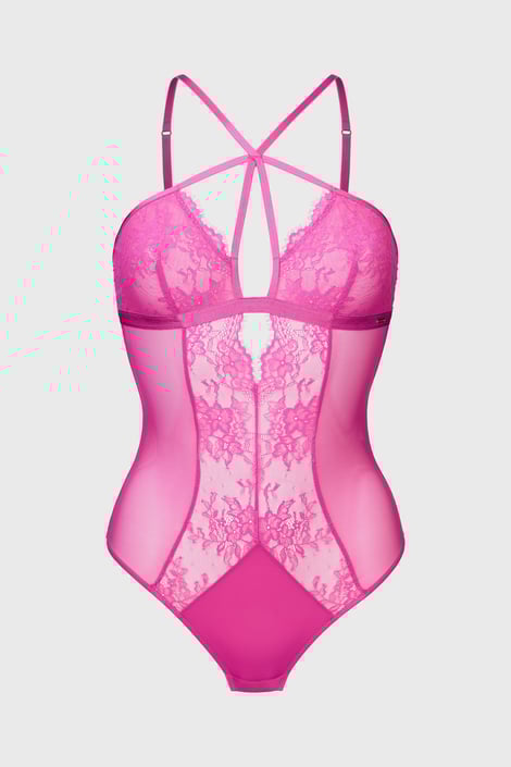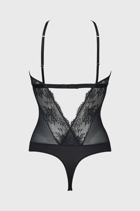Ubierz swoje ciało w kuszące, fantazyjne body Tessa z koronki i tiulu. W dekolcie wyróżniają się cienkie paski strappy, a pupę atrakcyjnie modeluje krój typu tanga.