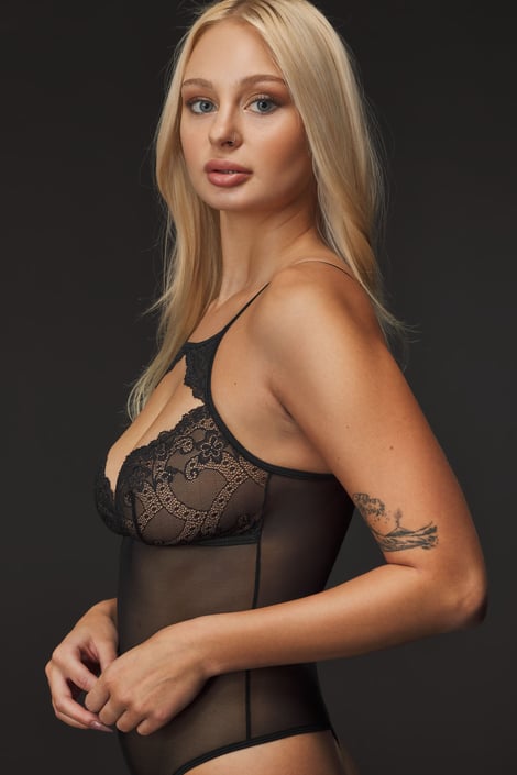 Body erotyczne Veronique zmysłowo odsłoni kobiece kształty. Okolicę dekoltu ozdobi koronka z kwiatowym wzorem, a Twoje ciało subtelnie przesłoni delikatna siateczka.