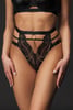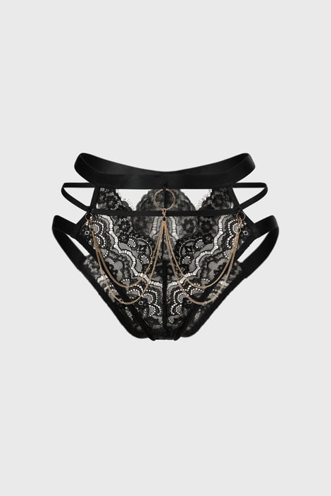 Kuszące majtki Hunkemöller Tallulha z prześwitującej koronki i fantazyjnych pasków. Przód zdobi aplikacja z łańcuszków, którą możesz odpiąć. Z otwartym krokiem dla Twojej rozkoszy.