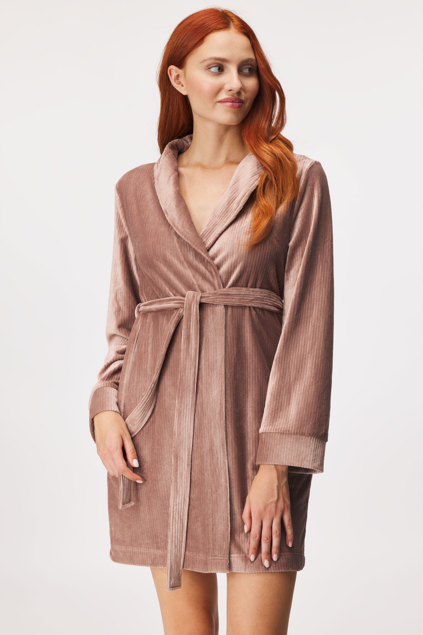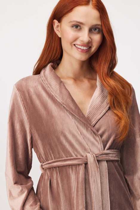Aksamitnie miękki szlafrok Rose w pięknym odcieniu brudnego różu. Strona wewnętrzna ma ciepły meszek, a zewnętrzna jest delikatnie prążkowana.