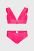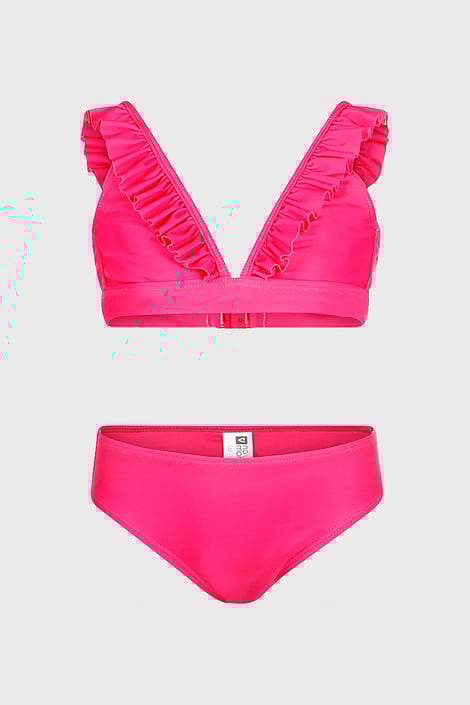 Dwuczęściowy dziewczęcy strój kąpielowy Fuchsie w intesywnym różowym kolorze. Górna część jest ozdobiona subtelną falbanką.