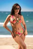 W dwuczęściowym stroju kąpielowym Burgundy Bloom wprost będziesz błyszczeć nad morzem i na basenie. Biustonosz z niskim mostkiem i wiązaniem na szyi pięknie podkreśli krągłość dekoltu. Nieusztywniane miseczki na fiszbinach zapewnią komfort także dużemu biustowi. Obwód zawiążesz na plecach, dostosowując go do swoich potrzeb. Majtki mają klasyczny krój. Barwny kwiatowy wzór jest przetykany połyskującą nitką. Specjalny materiał jest zaopatrzony w ochronę przeciwko promieniowaniu UV.