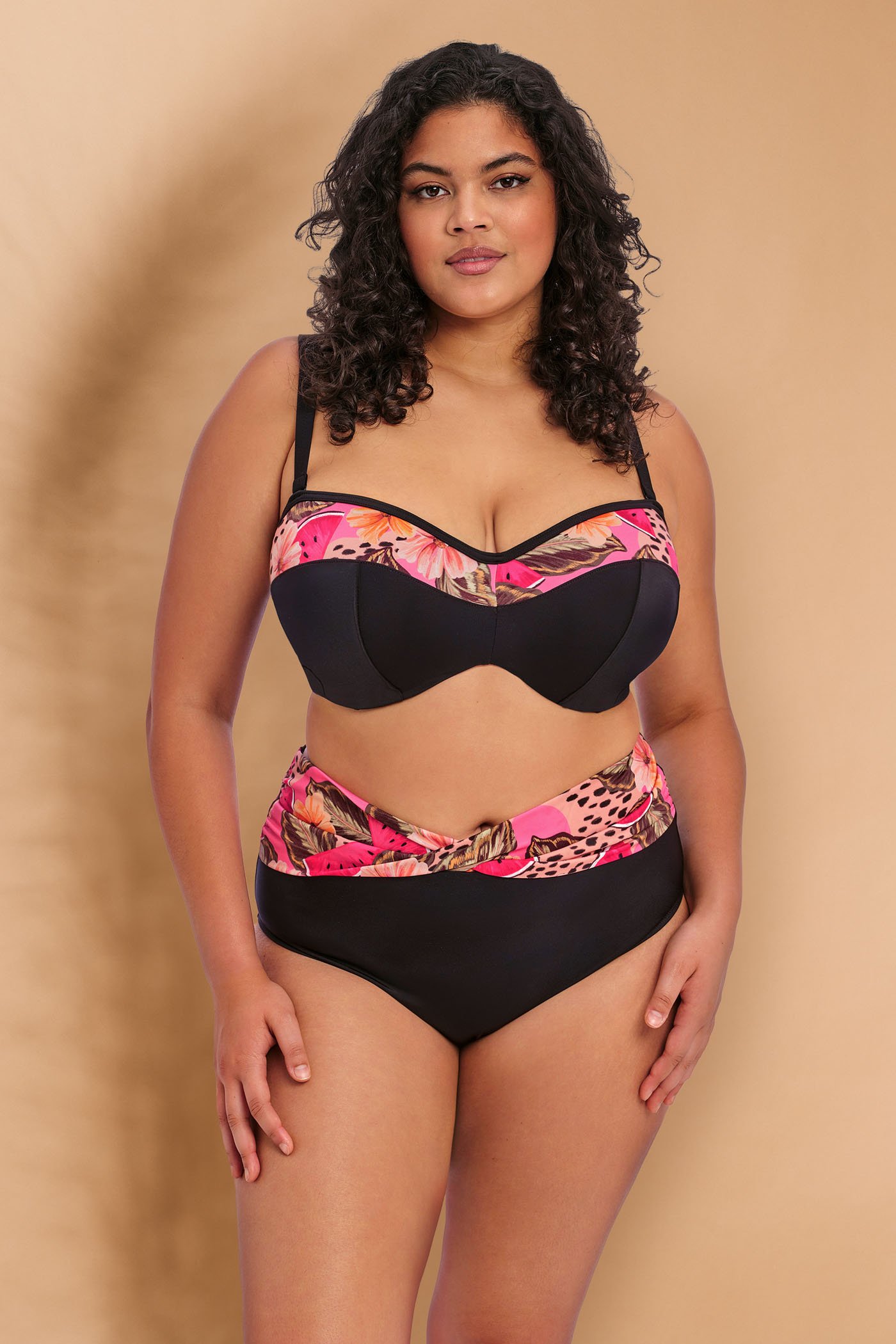 Dwuczęściowy strój kąpielowy Elomi Cabana Nights zapewni Ci pewność siebie na plaży i na basenie. Bardotka lekko unosi biust, a dwa pionowe szwy atrakcyjnie go zaokrąglają. Ramiączka można odpiąć, dowolnie skrzyżować albo całkowicie odczepić, aby cieszyć się idealną opalenizną ramion. Wysokie majtki dyskretnie maskują brzuch.
