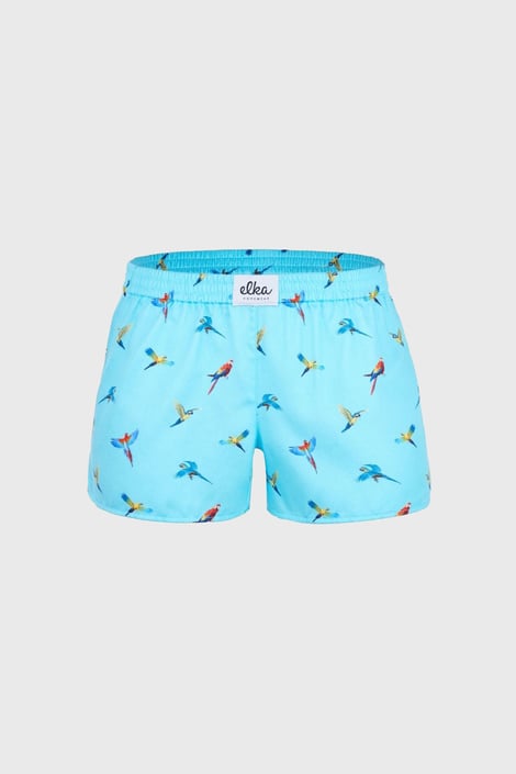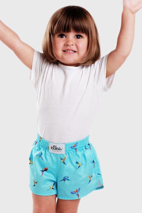 Dziecięce szorty ELKA LOUNGE uszyte z gładkiej bawełnianej satyny, dzięki której są bardzo wygodne do spania i do noszenia w domu. Ze wzorem w papugi.