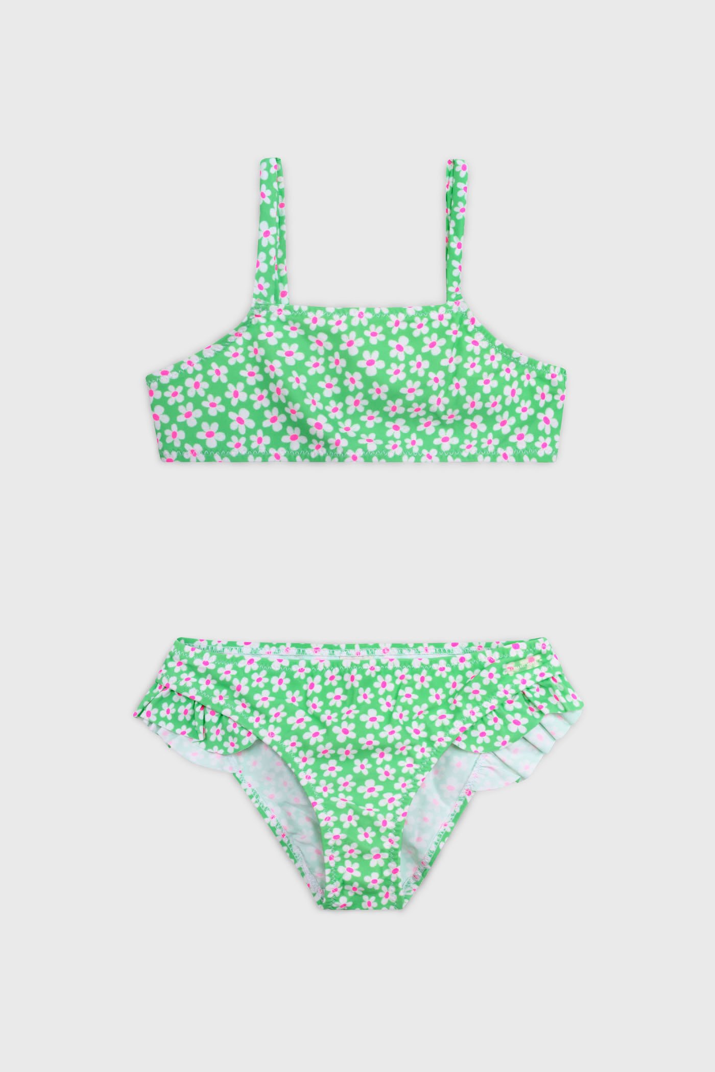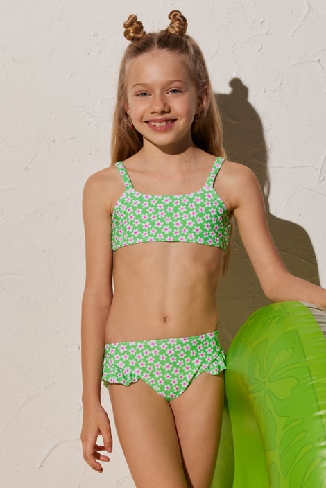 Dwuczęściowy dziewczęcy strój kąpielowy Florea z subtelnym kwiatowym wzorem. Górną część o kroju typu lambada uzupełniają majtki z ozdobnymi falbankami.