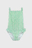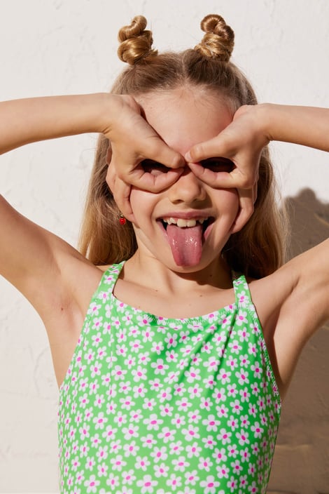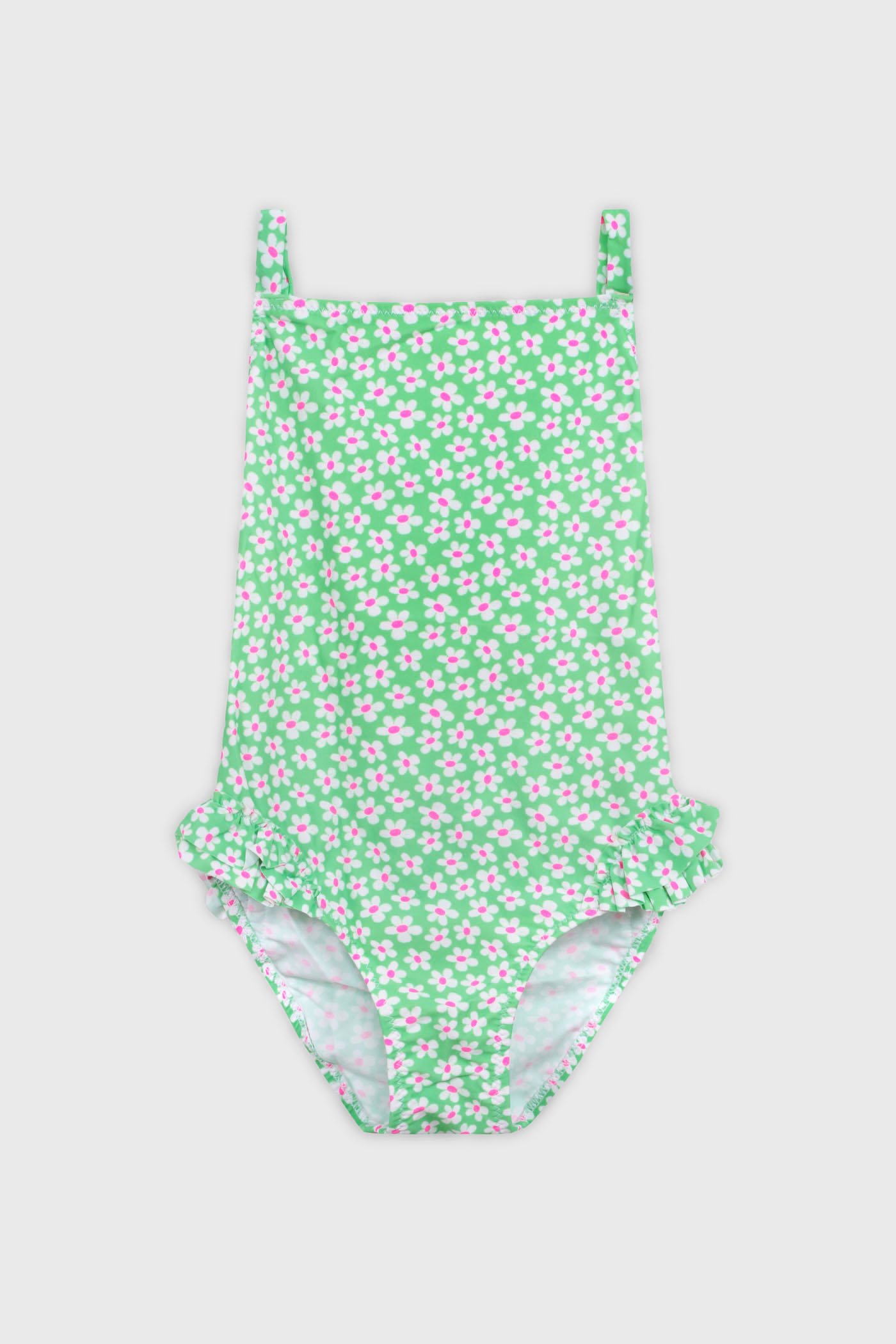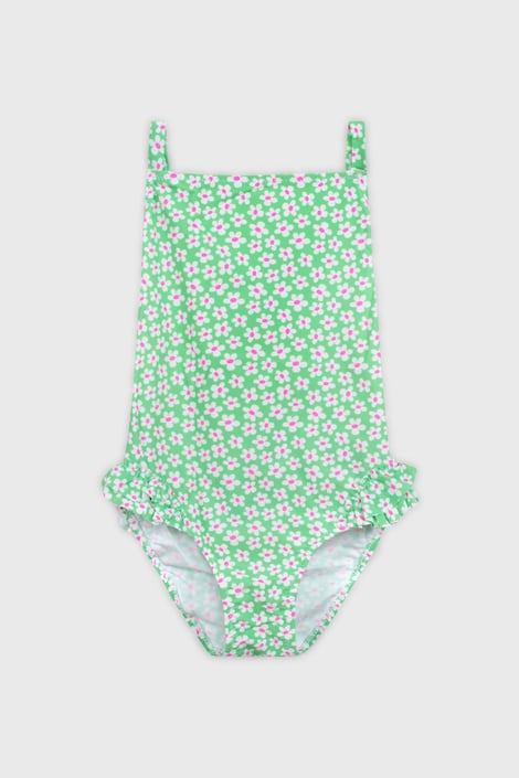 Jednoczęściowy dziewczęcy strój kąpielowy Florea do letniego relaksu nad wodą. Na plecach wyróżniają się skrzyżowane ramiączka, po bokach ozdobne falbanki.