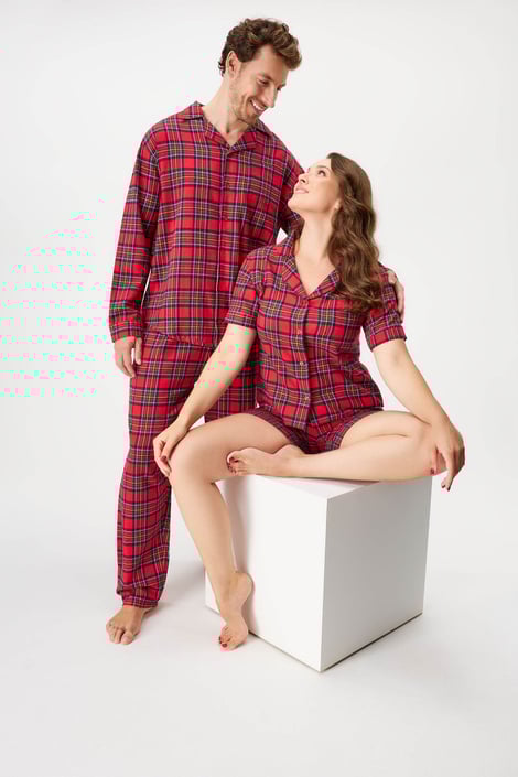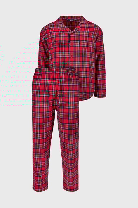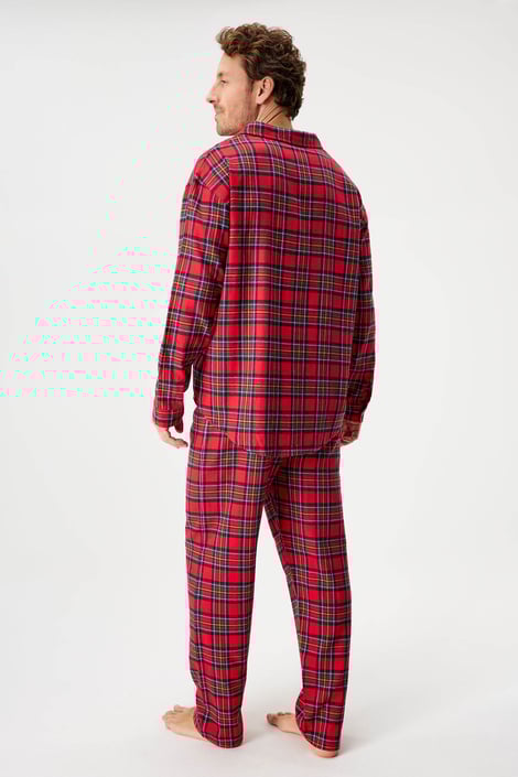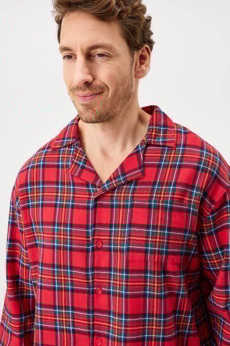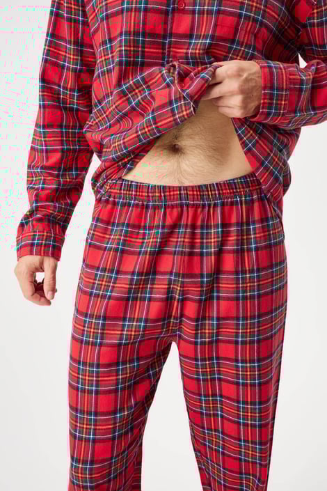 Flanelowa piżama męska MEN-A Festive Red ze 100% bawełny to gwarancja ciepła w chłodne noce. Z klasyczną koszulową górną częścią z zapięciem na guziki na całej długości i długimi luźnymi spodniami.