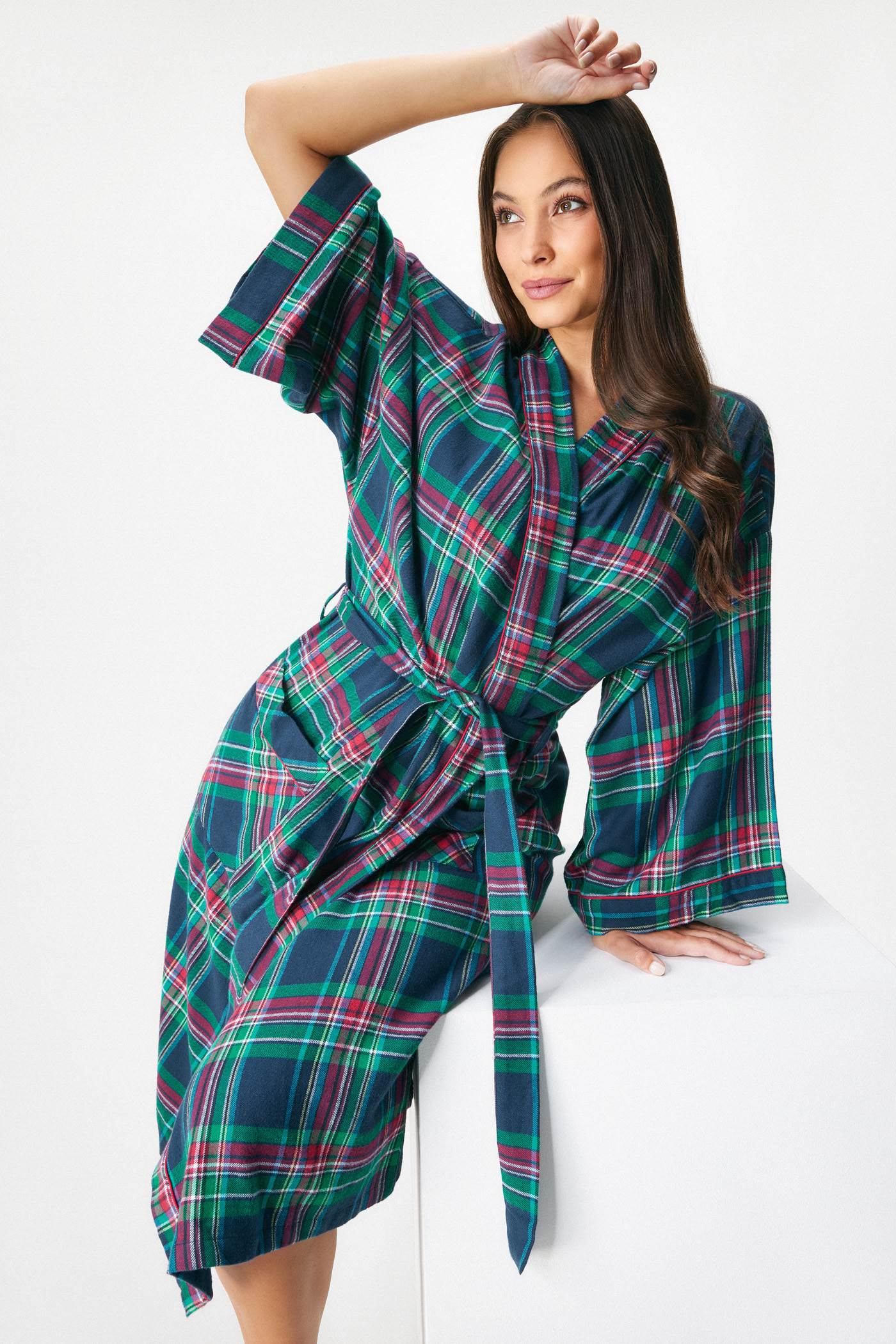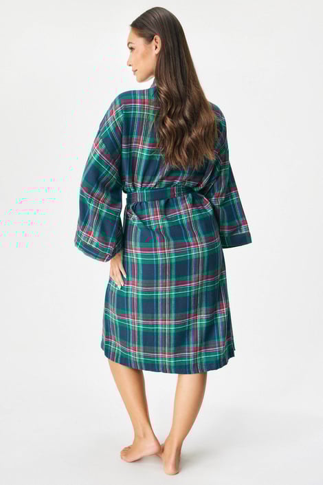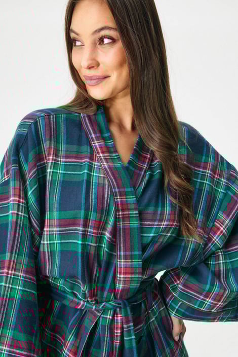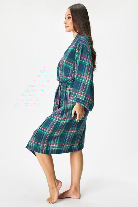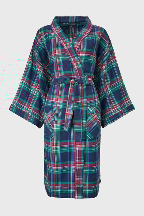 Flanelowy szlafrok Festive Lights ze wzorem w kratkę stanie się Twoim ulubionym towarzyszem. Otul się mięciutką bawełną i ciesz się przyjemnym czasem. Model o luźnym kroju z wiązaniem w talii pasuje na każdą sylwetkę. Projekt specjalistów z Astratexu.