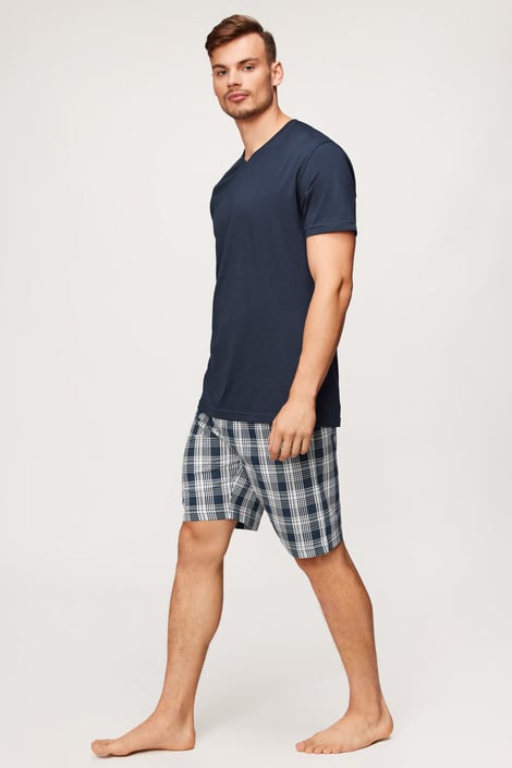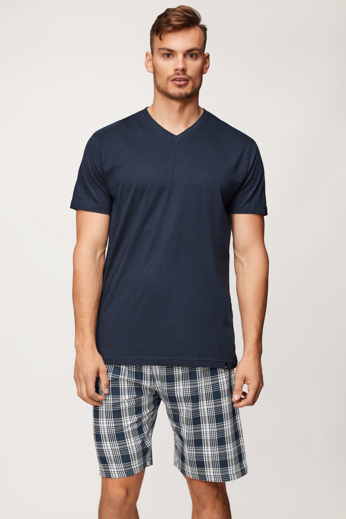 Męska piżama Bugatti ze 100% bawełny dla Twojej wygody w nocy. T-shirt jest jednobarwny, a krótkie spodenki zdobi wzór w kratkę.