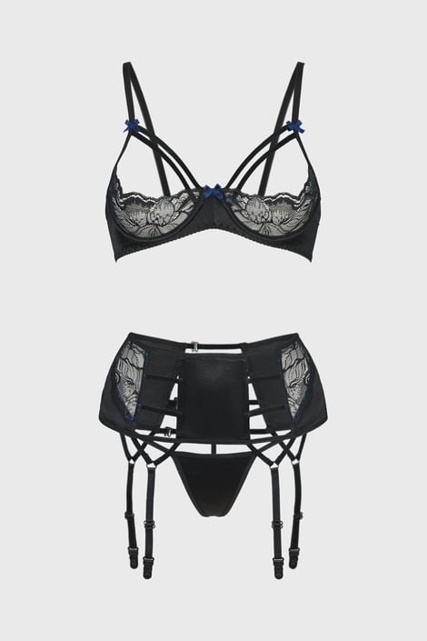 Komplet erotyczny Meredith do Twoich miłosnych igraszek. Biustonosz z paskami strappy ma otwarte miseczki, które pozwolą wyeksponować Twoje piersi. Talię podkreśli pas do pończoch, a pupę majtki typu tanga.