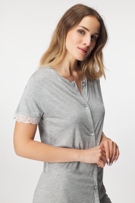 Koszula nocna Florence Romance uszyta ze 100% wiskozy, która swobodnie spływa po ciele. Krótkie rękawy są wykończone subtelną koronką. Z zapięciem na guziki na całej długości.