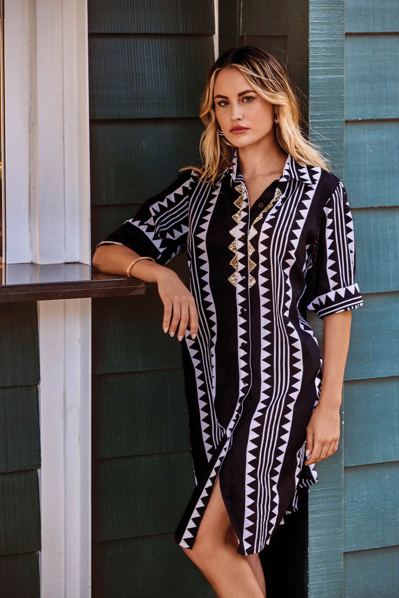 Koszulowa sukienka plażowa Vacanze Romina z bawełnianej tkaniny będzie praktycznym elementem Twojej garderoby. W ciągu dnia możesz ją narzucić na strój kąpielowy, a wieczorem w zapiętej sukience możesz udać się na kolację. Górna część linii guzików jest ozdobiona drobnymi koralikami.