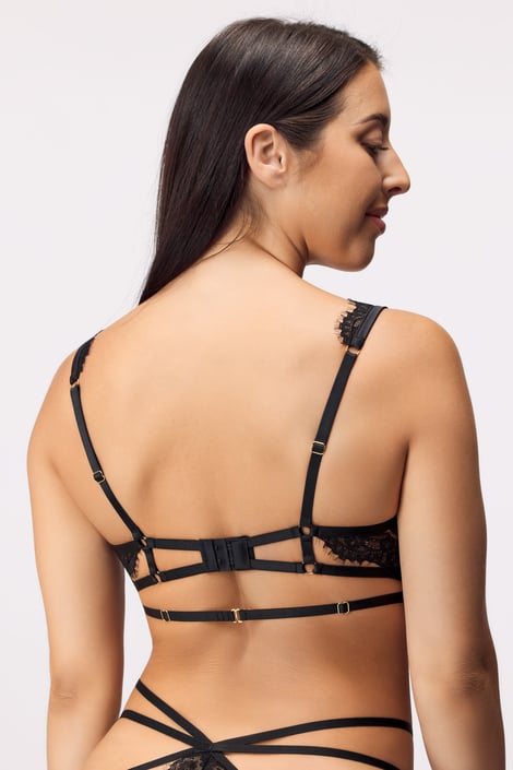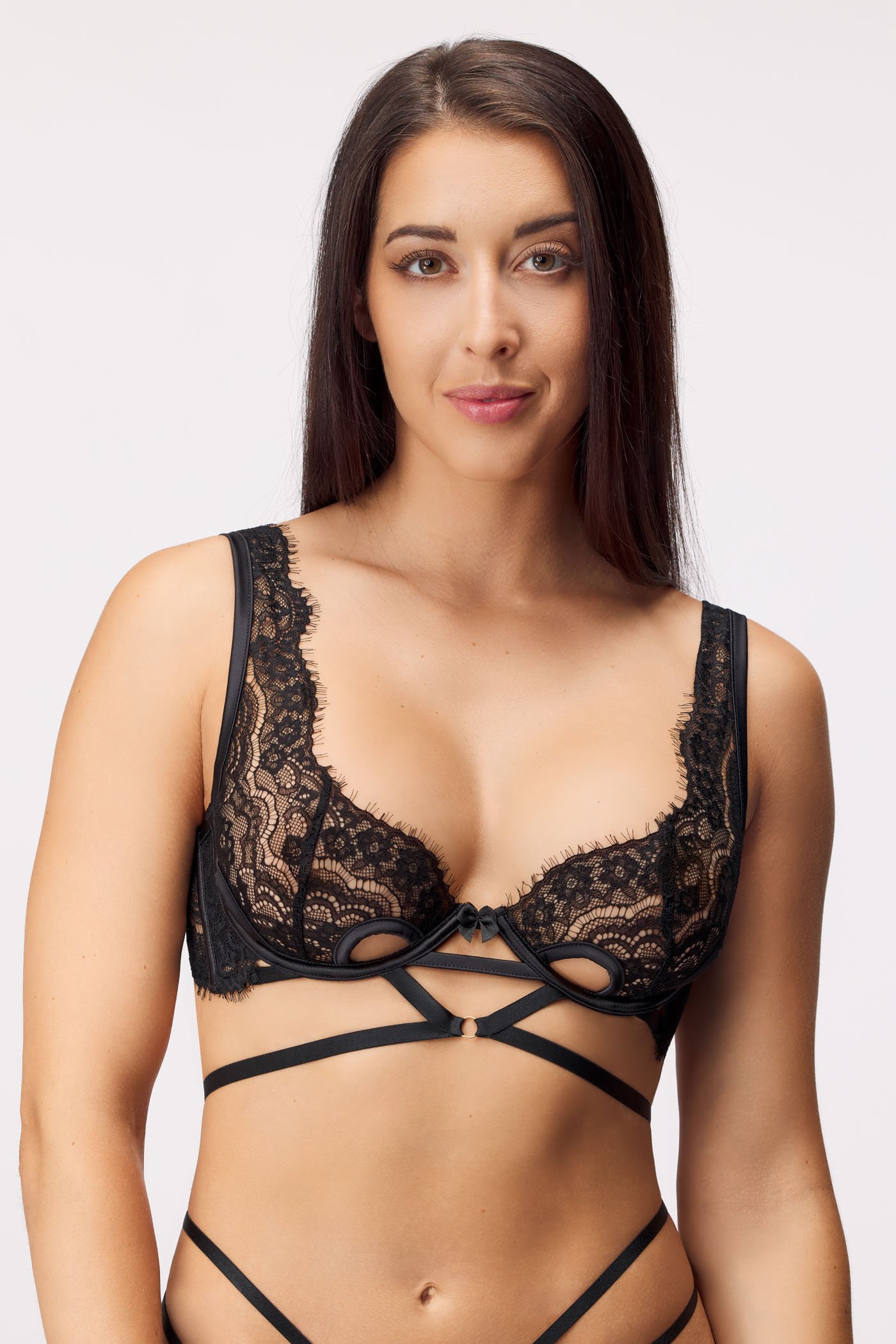 Biustonosz Seraphina to kuszący model na wieczorne igraszki. Zmysłowo prześwitujące miseczki z delikatnej koronki są ozdobione fantazyjnymi wycięciami, które uzupełniają efektowne paski strappy.
