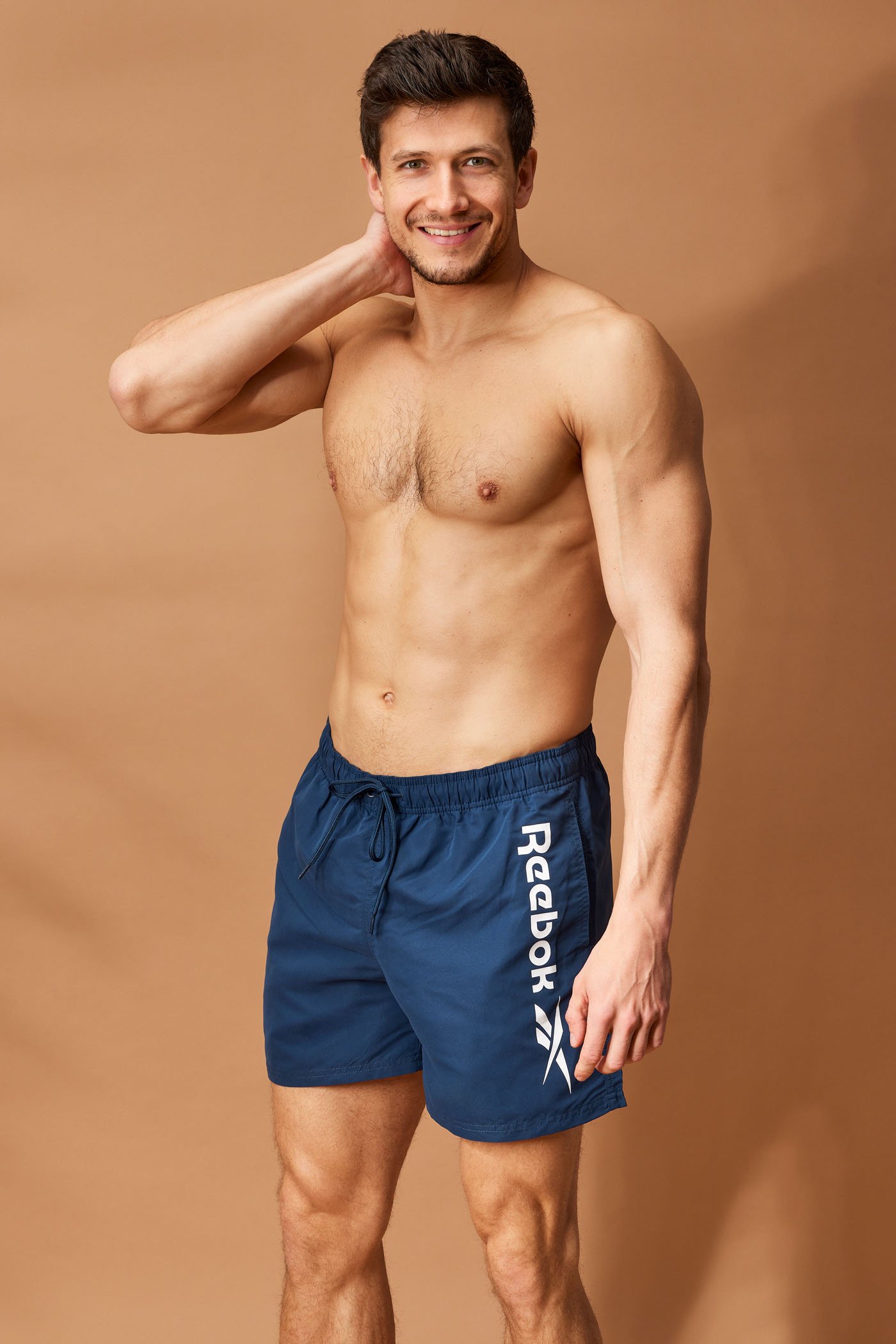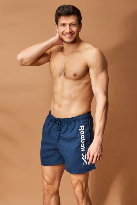 Męskie szorty kąpielowe marki Reebok w kolorze niebieskim. Po wewnętrznej stronie podszewka z miękkiej, przewiewnej siateczką, w pasie sznurówka do jego regulacji, a po bokach kieszenie. Wewnątrz spodenek praktyczna kieszonka na drobiazgi.