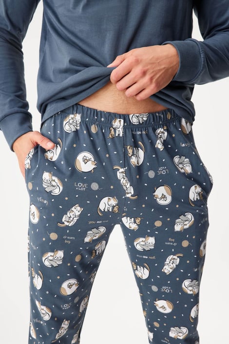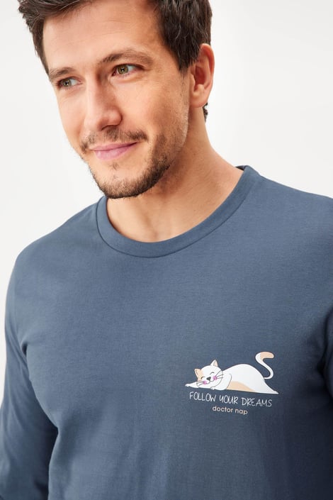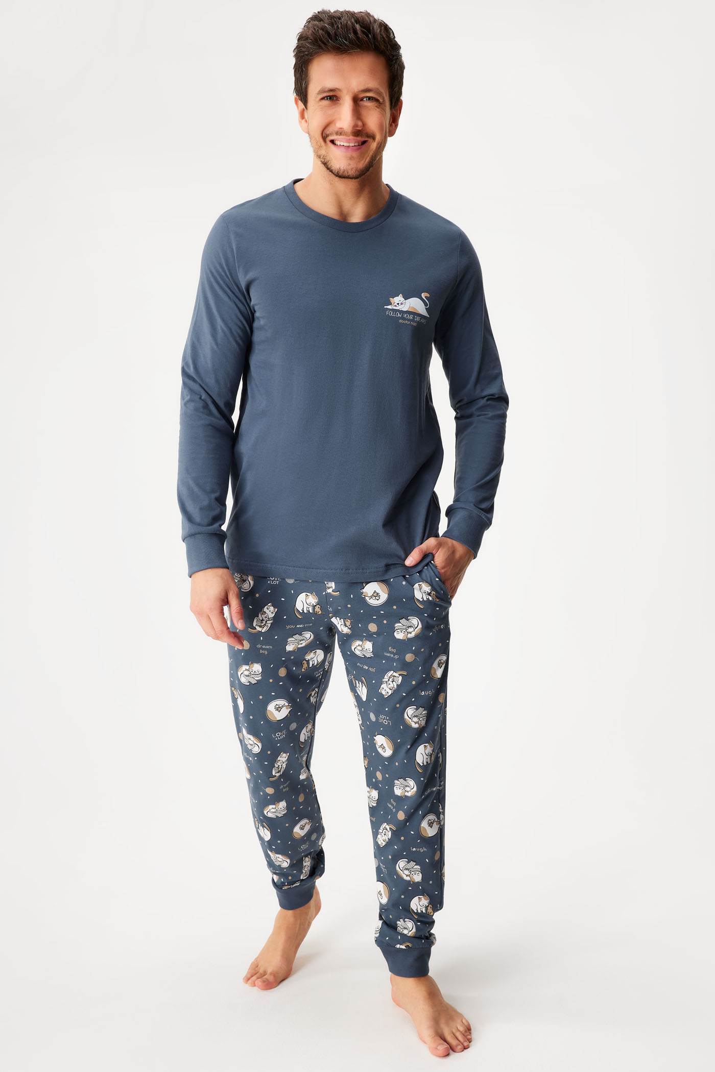 Bawełniana piżama męska Follow Your Dreams zapewni Ci komfort w nocy. Koszulkę i długie spodnie zdobi uroczy wzór w kotki.