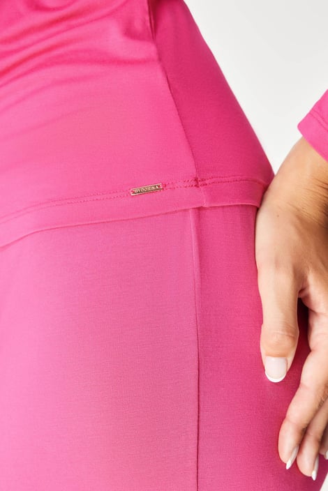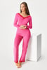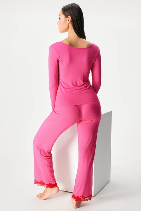 Piżama Origins uszyta z dzianiny wiskozowej, która pięknie spływa po ciele i jest bardzo wygodna. Prosty model zdobi bogata koronka na nogawkach i w szerokim dekolcie. Z długimi rękawami i spodniami.