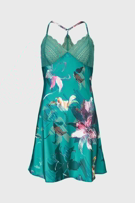 Satynową koszulkę nocną DIAMOND Annabelle z kwiatowym wzorem docenisz nie tylko w gorące letnie noce. Twoje piersi i górną część pleców przesłoni okazała koronka. Regulowane ramiączka są skrzyżowane z tyłu. Projekt specjalistów z Astratexu.