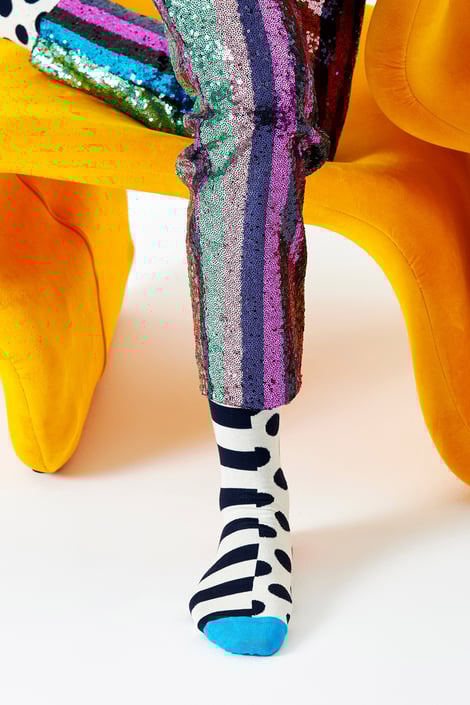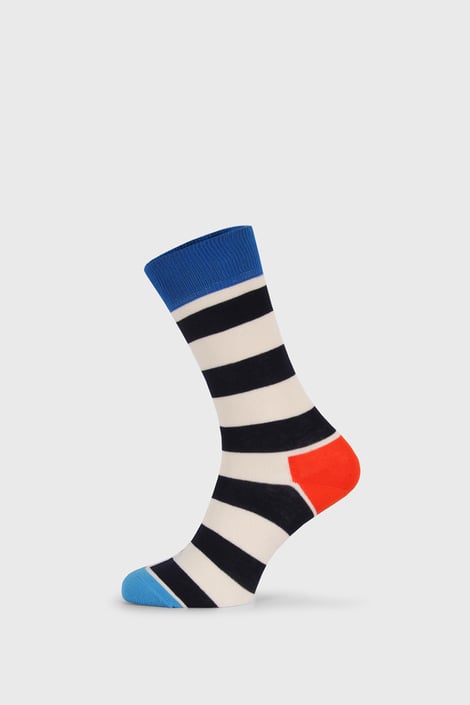 Każda inna, a mimo to do siebie pasują. Skarpetki Happy Socks Stripe Dot o wyższym kroju są całe w kropki i paski. Na każdej z nich jest inny wzór. Miły bawełniany materiał pięknie dopasowuje się do nóg.