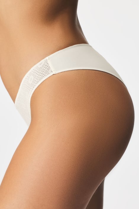Stringi Katie z koronką z nietypowym geometrycznym wzorem.