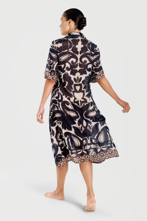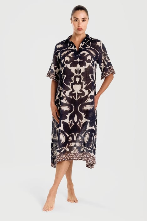 Sukienka plażowa Miradonna Asia z grubszej bawełnianej tkaniny zachwyci Cię niecodziennym wzorem. Model o prostym kroju z dekoltem typu V i eleganckim kołnierzykiem.