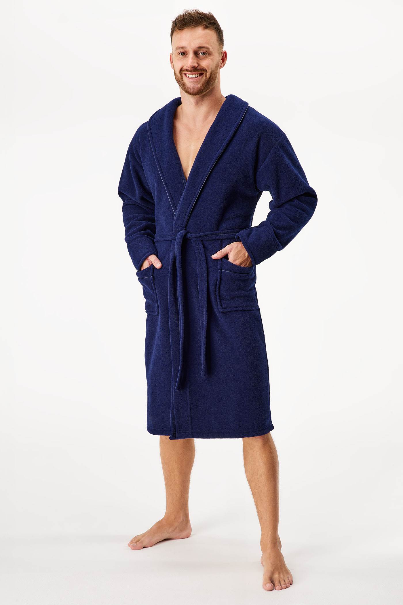 Szlafrok męski Marco przyjemnie Cię ogrzeje w chłodne miesiące. Z wierzchu jest aksamitnie miękki, a kieszenie zdobi połyskująca satynowa tasiemka.