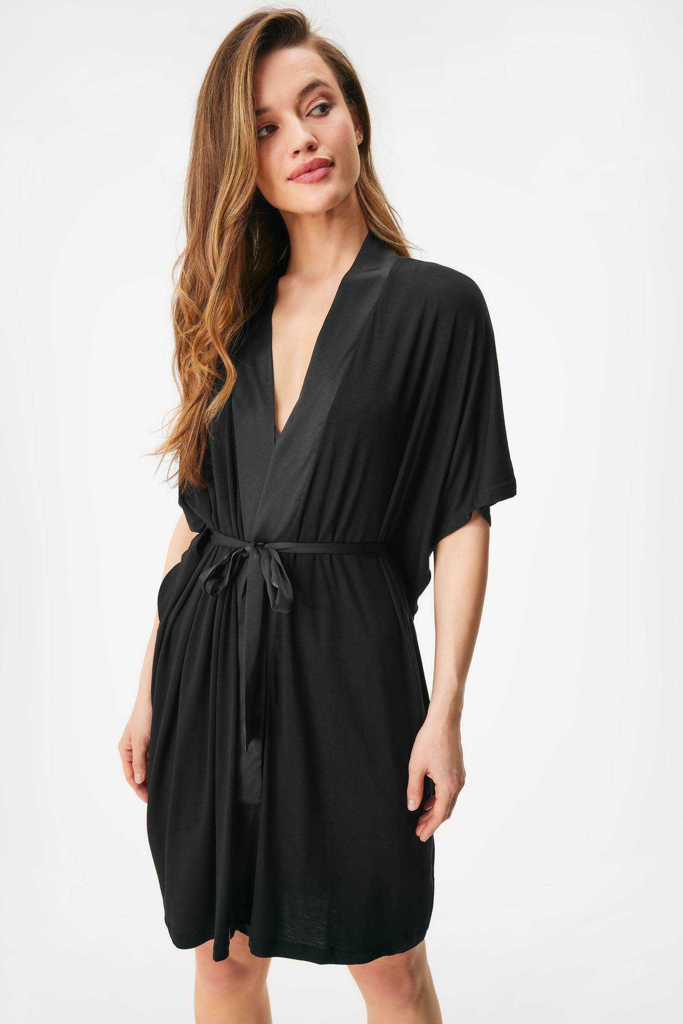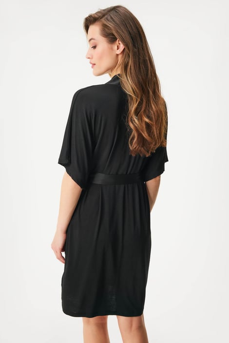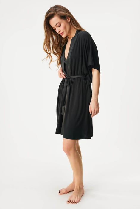 Szlafrok Rirri z chłodzącej wiskozy na ciepłe letnie wieczory. Model w eleganckim kolorze czarnym z wiązaniem w pasie.
