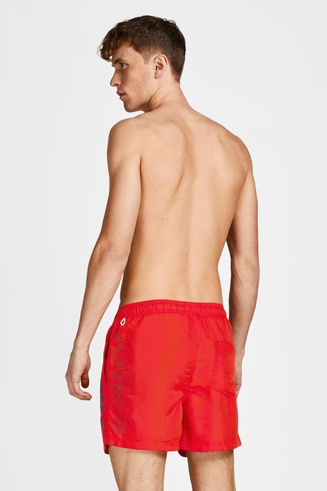 Jednokolorowe szorty kąpielowe AKM Logo firmy JACK AND JONES z lekkiego, szybkoschnącego materiału. W wewnętrznej stronie znajduje się delikatna siatka. W pasie jest kontrastowy ściągający sznurek, na boku jest wyraźne logo firmy.