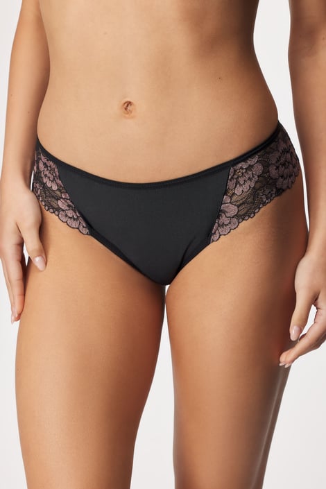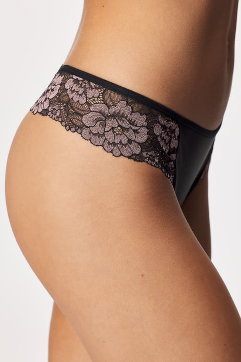 Te zmysłowe figi typu tanga mają na imię Tavia. Lekko lśniącą mikrofibrę zdobi przepięknie haftowana koronka, którą w tylnej części dopełnia imitacja sznurowania.